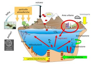 La più prevedibile sarà la torbidità elevata per le forti piogge di inizio primavera che hanno aumentato la portata del Po riversando in mare un’enorme quantità di sedimenti sospesi che rendono l’acqua in modo visibile “marrone o grigia” soprattutto al Lido di Volano e al Lido delle Nazioni. Ciò spaventa i turisti anche se è bene sottolineare che non si è sempre in presenza di inquinamento batterico. I sedimenti sospesi, spiega l’Ispra (l’Istituto Superiore per la Protezione e la Ricerca Ambientale) è un parte molto fine del materiale organico e inorganico che si deposita al fondo dei bacini acquatici secondo uno schema illustrato qui sotto.