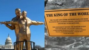 I due appaiono in posa come i protagonisti del Titanic in una delle scene più iconiche del film. Ai lati della statua la scritta: “La tragica storia d’amore tra Jack e Rose è stata costruita su viaggi di lusso, feste chiassose e ritratti segreti di nudo. Questo monumento onora il legame tra Donald Trump e Jeffrey Epstein, un’amicizia apparentemente costruita su viaggi di lusso, feste chiassose e ritratti segreti di nudo.”